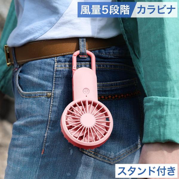 カラビナ付きでバッグやベルト通しに掛けて持ち運べる携帯扇風機