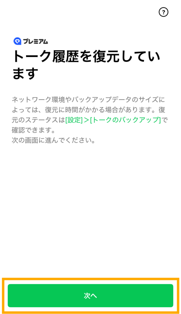 - 9「トーク履歴を復元しています」と表示されたら「次へ」をタップ