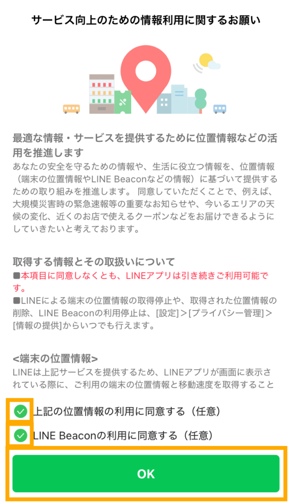 - 11「サービス向上のための情報利用に関するお願い」として、位置情報とLINE Beaconの利用の意思確認画面が表示される
