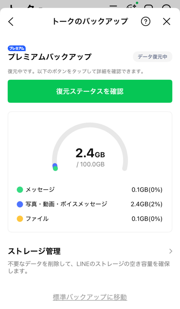 | 保存対象 | テキストメッセージ | プレミアムバックアップ実施後全期間のトーク履歴、写真、動画、添付ファイル、ボイスメッセージ |