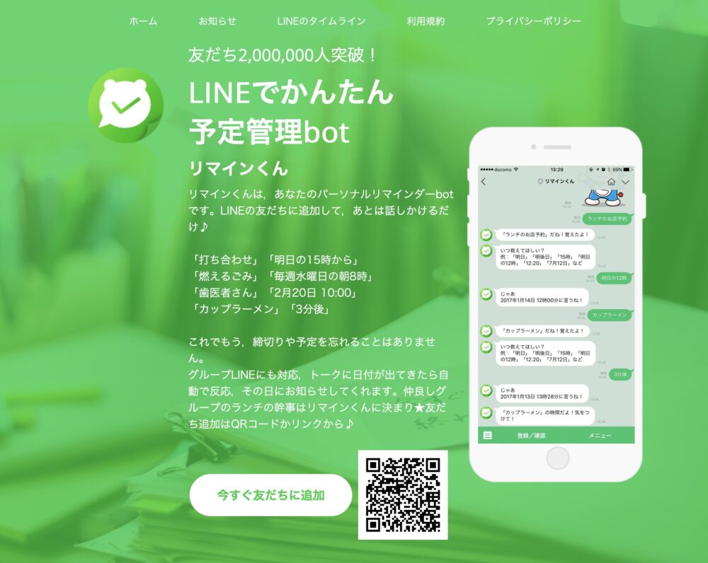 LINEで友だち追加するだけで使える、パーソナルリマインダーbot「リマインくん」。