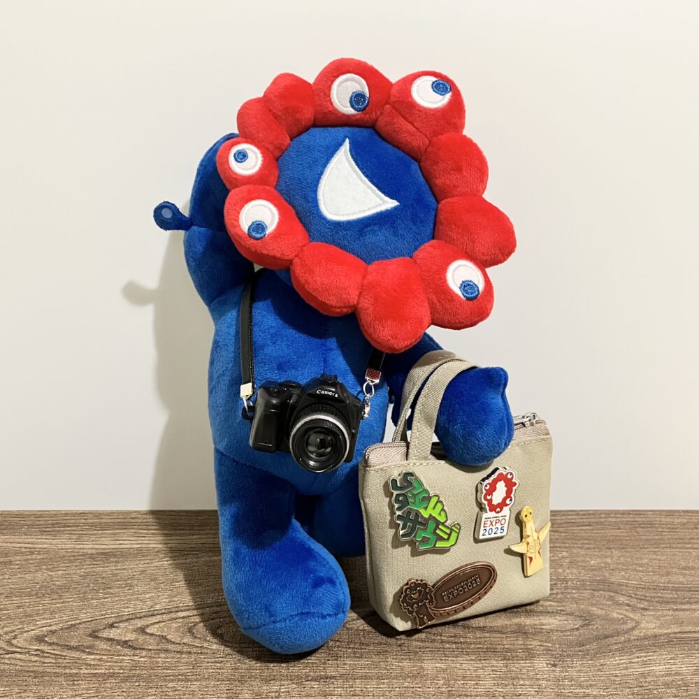 あと、「ミャクミャクくじ」の3等でもらったぬいぐるみに手芸屋さんで見つけたミニチュアカメラを付けてみたら、想像以上にかわいくなっております!